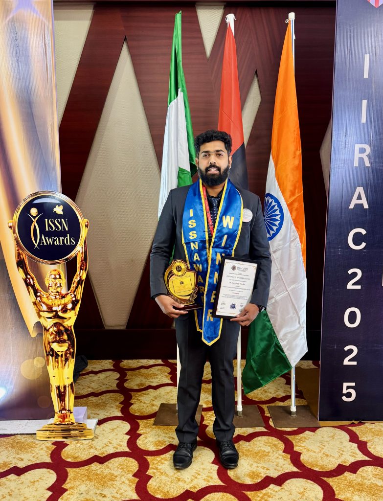 Myself Dr Jeetendra A. J, Assistant Professor, Department of Shalya Tantra working in SJGAMCH Koppal, Karnataka, India. I have completed my PG studies and perusing my Ph.D. in Rajiv Gandhi University of Health Sciences Karnataka. Excellence in the field of treating all kind surgical and para-surgical disorders including non-healing wounds in Ayurvedic line of management. Total clinical experience – 7 years. I thank ISSN[International Society for Scientific network awards]for giving this award and opportunity.